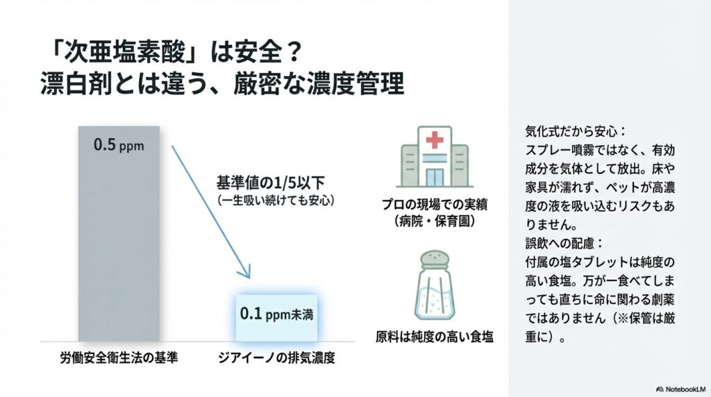 結論から言うと、ジアイーノから放出される次亜塩素酸の濃度は、人体やペットに影響がないレベルに厳密にコントロールされています。
